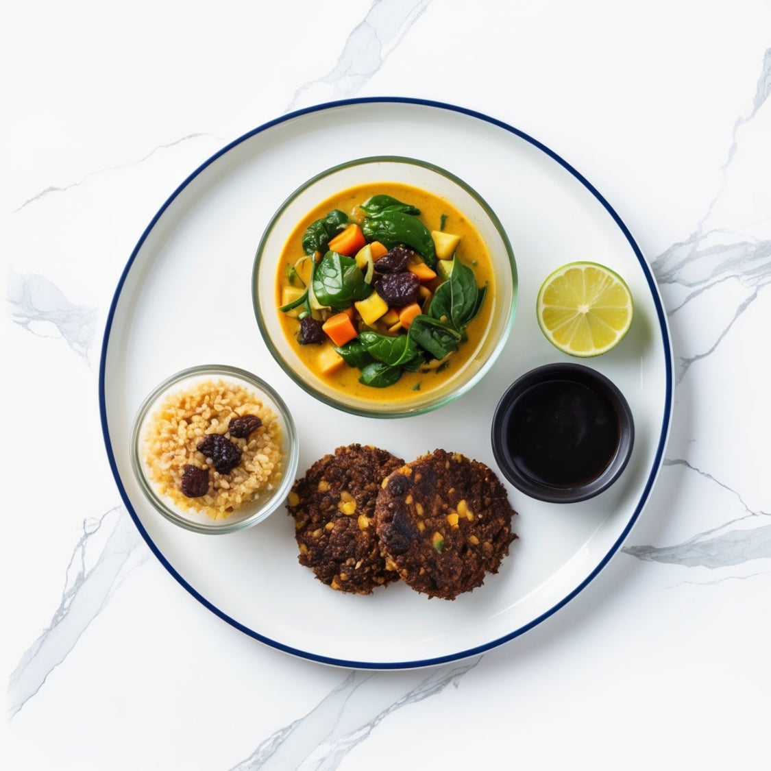 Slow roasted seasoned mixed vegetables in an authentic Indian coconut curry served with onion bhaji s and spiced mango and prune chutney