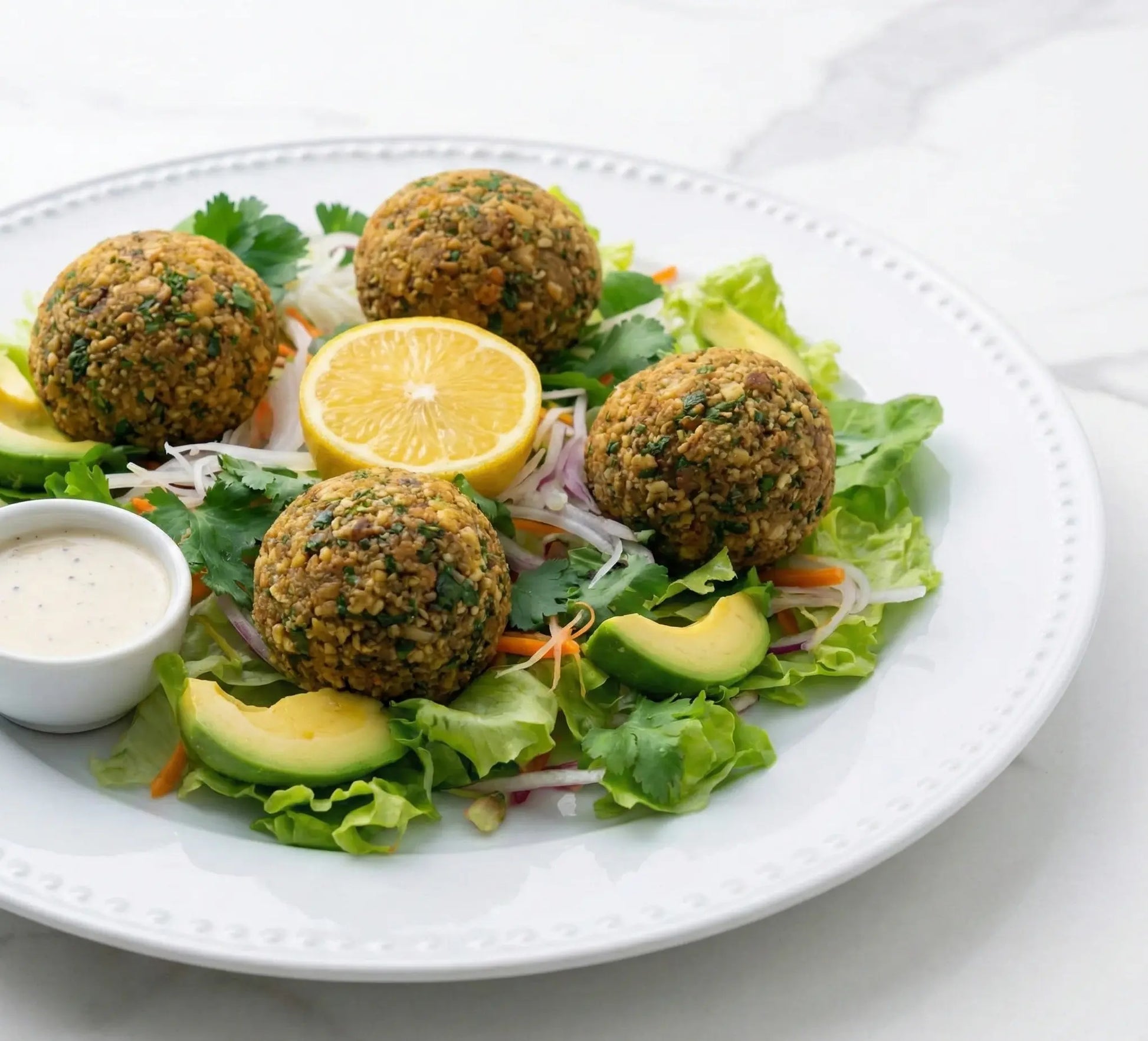 Tangy dry fruit & nut cheese balls on a bed of organic mixed salad with truffle dressing. Capers, Falafel.