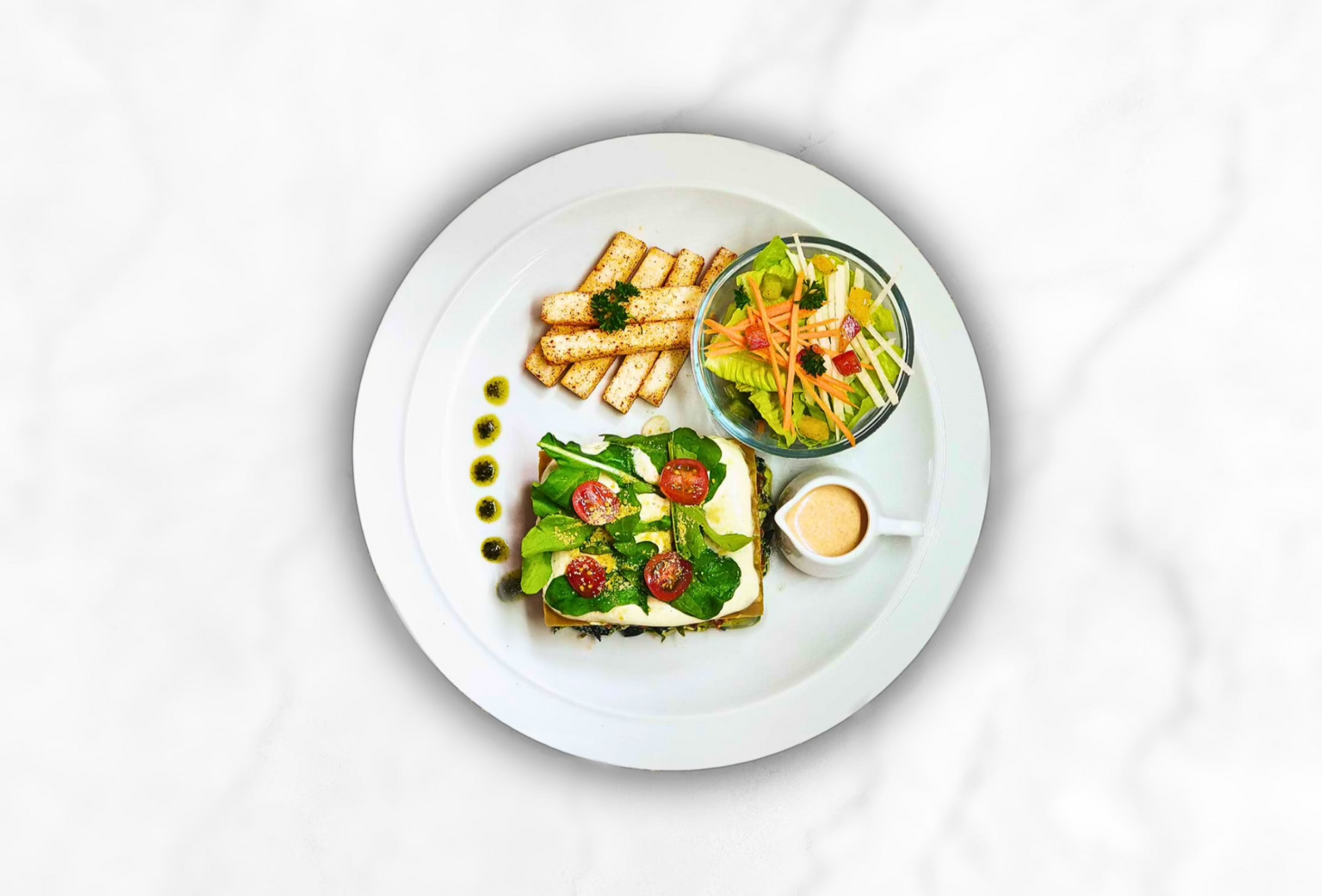 Indulge in this vibrant, nutritious, raw vegan twist on a classic dish. Dehydrated zuchini layers with walnut bolognese, cashew bechamel, smoky almond ricotta & wilted spinach.Sprinkled with our signature rawmesan and served with mixed salad & truffle jicama fries.