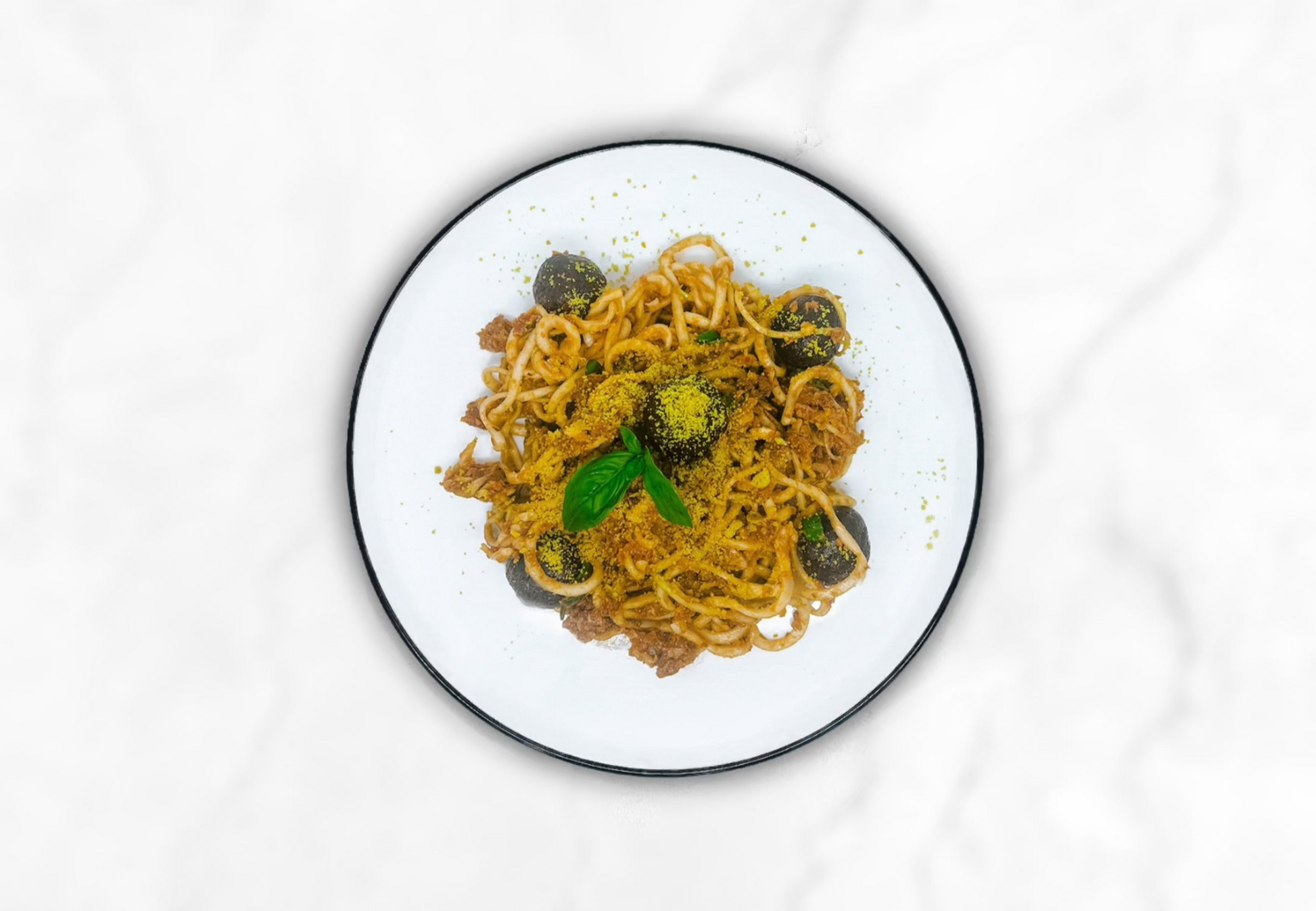 Hearty zucchini noodles with walnut bolognese sauce, spicy meatballs cashew cream & rawmesan